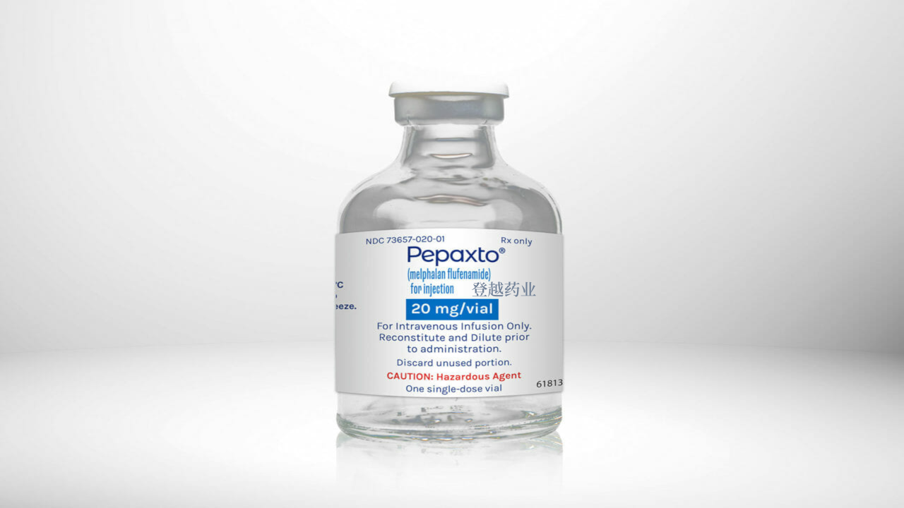 PEPAXTO 是一种烷化剂,与地塞米松联合使用,用于治疗复发或难治性多发性骨髓瘤成年患者,这些患者之前至少接受过四种疗法,并且对至少一种蛋白酶体抑制剂、一种免疫调节剂和一种 CD38 靶向单克隆抗体有耐药性。