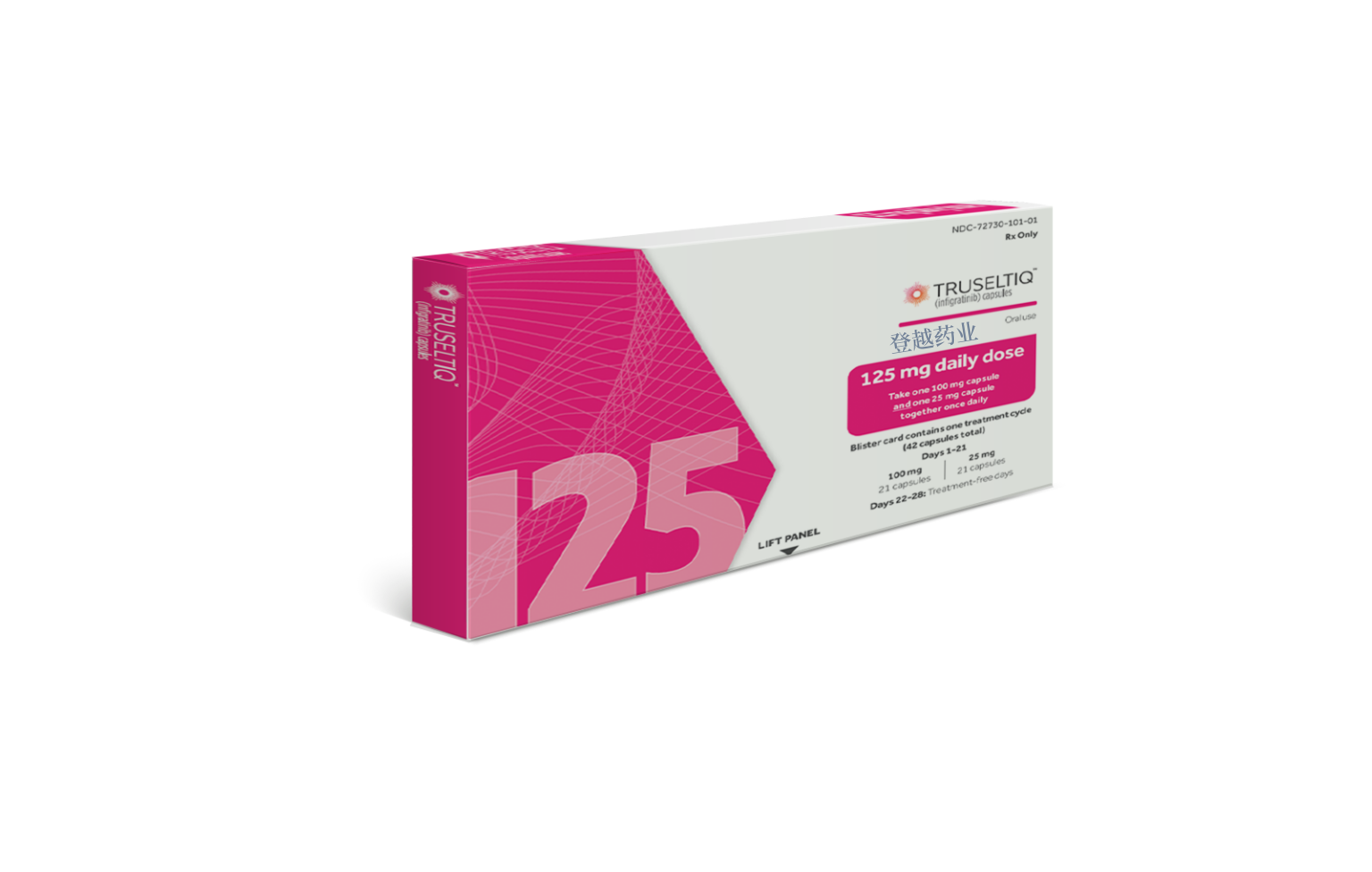 Truseltiq的推荐剂量为125mg,每天口服一次,连续用药21天,停药7天,28天为一个治疗周期。