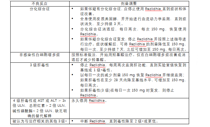 对于轻度(总胆红素<uln和任何ast style="margin: 0px; padding: 0px;">ULN或总胆红素> ULN的1至1.5倍和任何AST)或中度(总胆红素> ULN的1.5至3倍和任何AST)肝功能损害的患者,不建议调整剂量。对于轻度或中度肝功能损害的患者,密切监测分化综合征可能性的增加。对于严重肝功能损害(总胆红素>任何AST ULN的3倍)的患者,尚未确定Rezlidhia的推荐剂量。